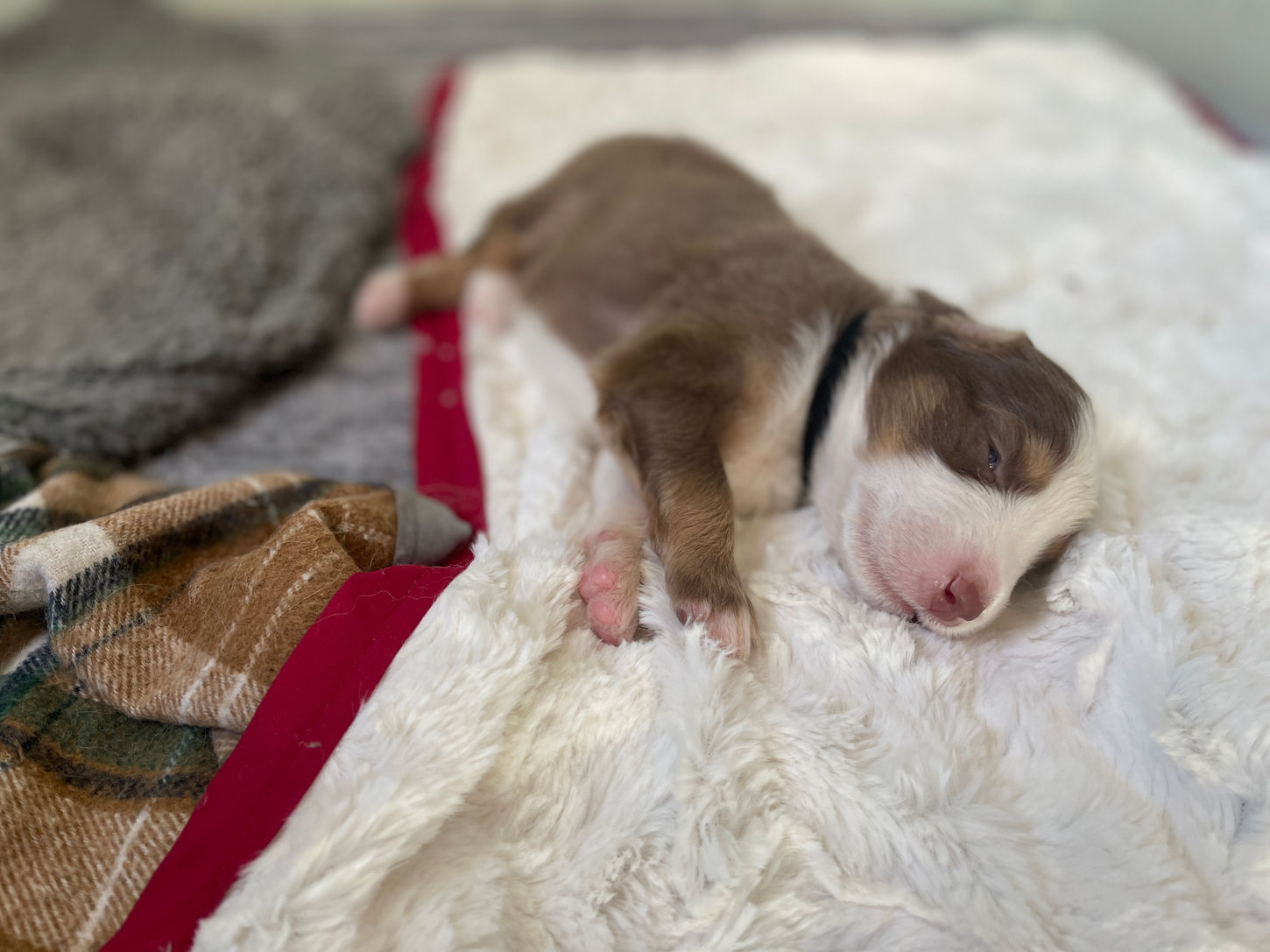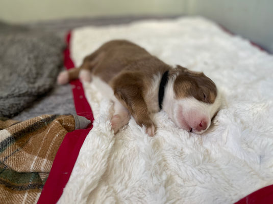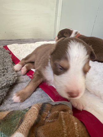 Porkchop is a Tri-Color, red, white and tan male Australian Shepherd puppy. His coat colors are one of the more rare combinations for Australian Shepherds. He will also have the feature of "tan eyebrows", or tan markings above his eyes, giving him the appearance of having eyebrows. Porkchop is a curious little puppy, even without his eyes opened yet, he likes to explore around the whelping box smelling for his littermates and momma. We will keep you updated on his personality as his eyes open and the litter box becomes more active.