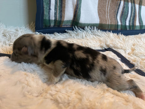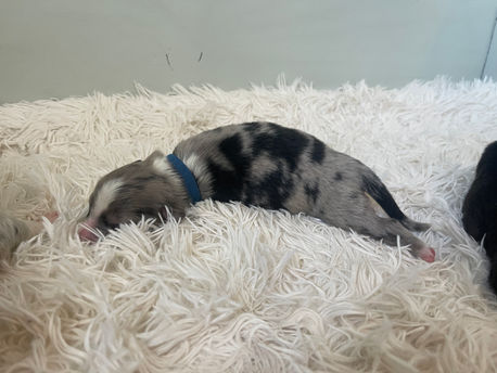 Chandler is a male, Blue Merle Australian Shepherd puppy born October 3, 2023. He is smaller for a male so far, and likely will grow to be 40 lbs max. His eyes are beautiful blue
