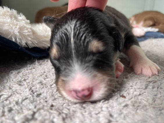 Frank Sinatra is a sweet, cuddly guy so far. We can tell he's going to be a calm, laid back pup as he will let you adjust him while he's sleeping, but can usually be found off to himself, not wanting to be bothered. We'll keep you updated on his personality as his eyes open and the puppies become more active.
