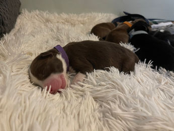 Audrey Hepburn is the most calm and quiet puppy out of the litter. She is perfectly happy playing with toys on her own but she does love to run around with her litter mates from time to time. She will likely have medium-level energy and attention needs — keeping in mind, most Australian Shepherds fall on the higher-end of that scale. She does come to greet us at the puppy box, but usually isn't one of the first ones in line, as her demanor is more laid back. We are happy to answer any questions about her and feel free to text us if you're interested in joining our live puppy cam!
